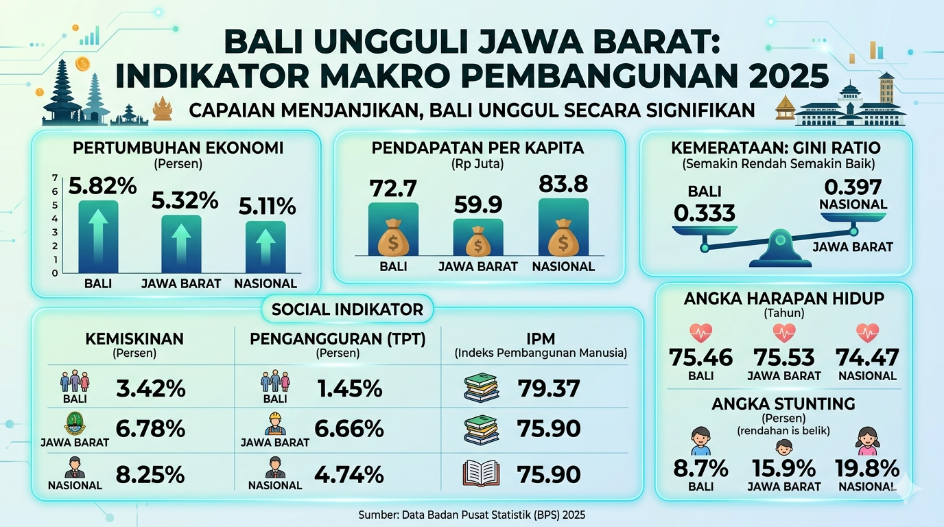 Berdasarkan data resmi yang diumumkan oleh Badan Pusat Statistik pada 5 Februari 2026, capaian indikator makro pembangunan Provinsi Bali Tahun 2025 menunjukkan kinerja yang sangat menggembirakan. Seluruh indikator utama mencatat hasil melampaui target perencanaan pembangunan sebagai implementasi visi Nangun Sat Kerthi Loka Bali melalui Pola Pembangunan Semesta Berencana dalam Bali Era Baru.